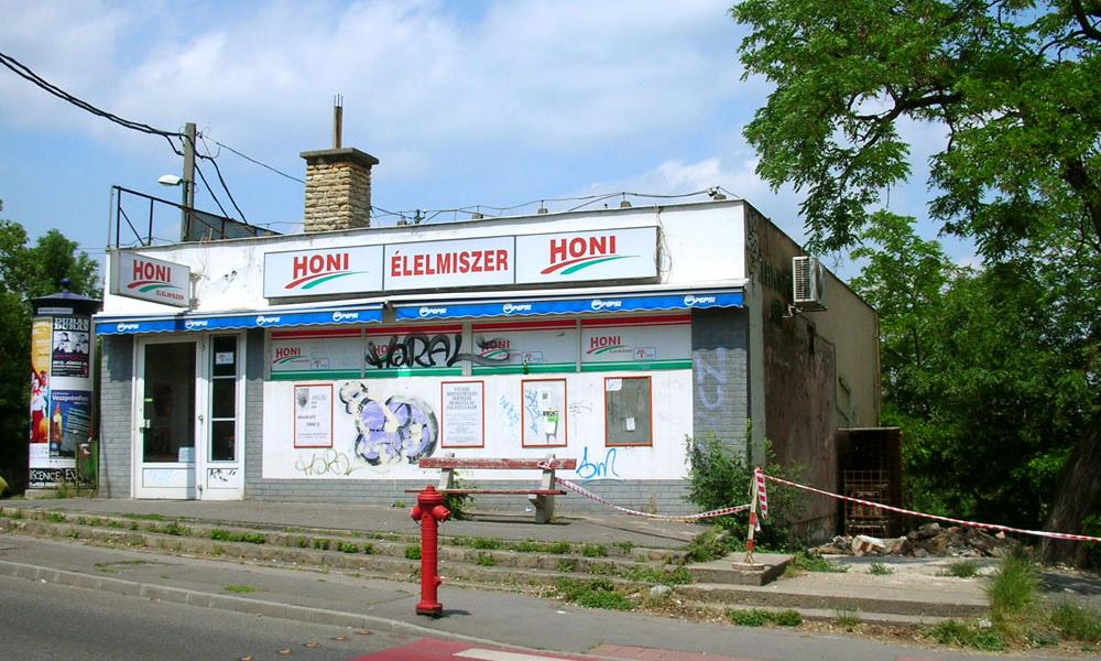 Kedves régi közért, ami mellől nemrégiben eltávolítottak egy épületet, és előkerült a régi kerámia felirat. Ma a Honi lánc tagja a bolt.